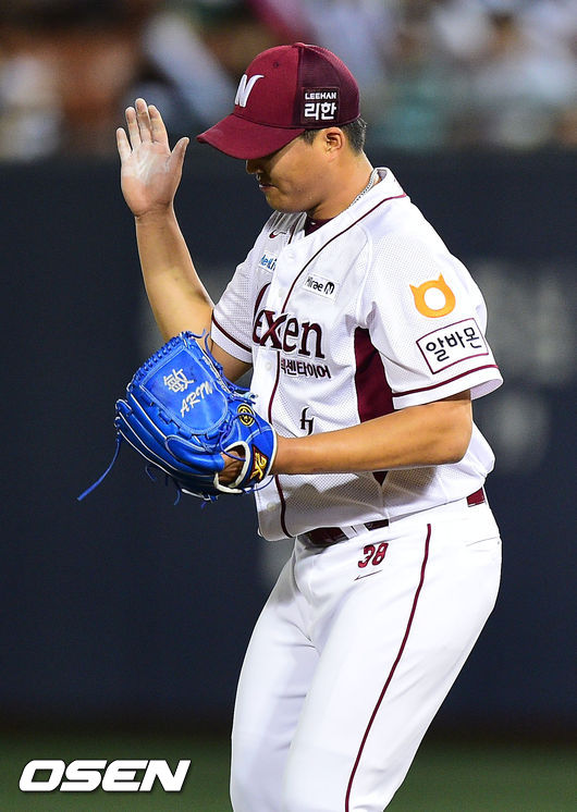 14일 오후 서울 목동구장에서 열리는 2014 한국야쿠르트 세븐 프로야구 넥센 히어로즈와 두산 베어스의 경기, 7회초 1사 만루 위기를 넘긴 넥센 김영민 투수가 환호하고 있다.