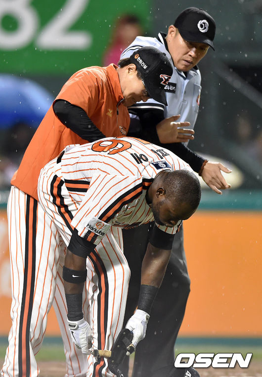 7회말 2사 3루에서 한화 피에가 박기택 구심의 삼진 판정에 불만스러운 어필을 하고 있다.