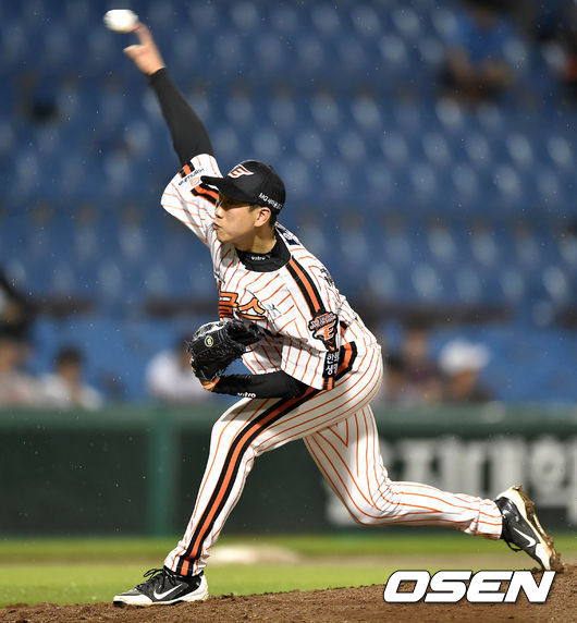 9회초 한화 김혁민이 힘차게 공을 던지고 있다.