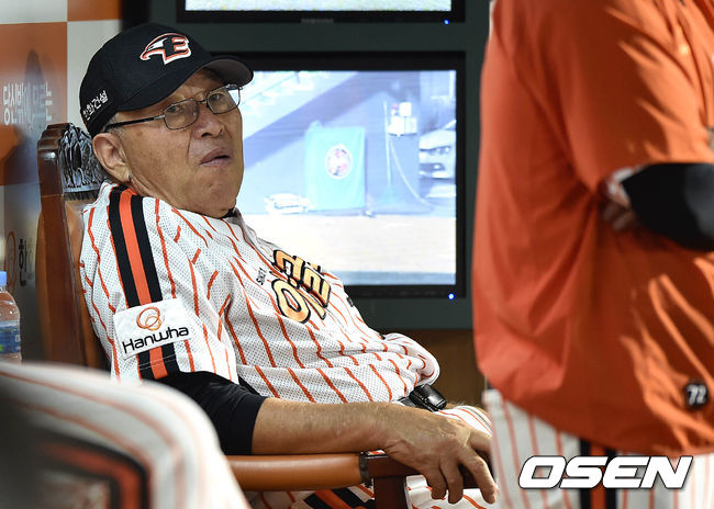 9회초 한화 김응룡 감독이 더그아웃에서 경기를 바라보고 있다.