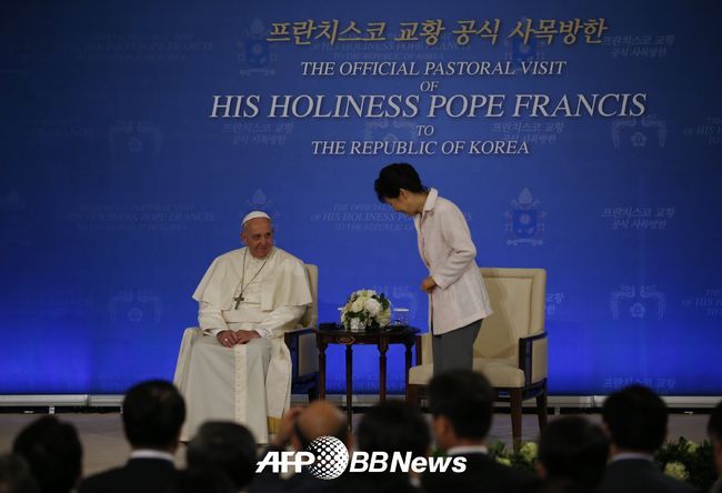 4박5일 일정으로 방한한 프란치스코 교황은 이날 11시간이 넘는 장기간의 비행에도 불구하고 온화한 미소를 지어보였다. 직접 영접한 박근혜 대통령이 "교황 방한 계기로 따뜻한 위로가 전해지고 분단과 대립의 한반도에 평화와 화해의 시대가 열리길 바란다"고 말하자 교황은 "마음 속에 깊이 간직하고 왔다"고 화답했다.