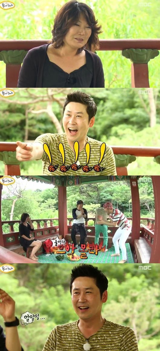 이어 신동엽은 "얼굴에 발을 쳐놓으면 알아보시겠냐"는 노홍철의 말을 듣고 그제서야 누나의 존재를 알아차렸다. 그는 기괴한 탄성을 내지르며 악수를 한 뒤 줄행랑을 쳤다.