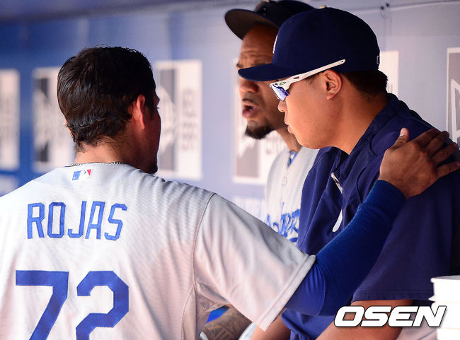 다저스 로하스가 더그아웃에 앉아있던 류현진과 이야기를 나누고 있다.