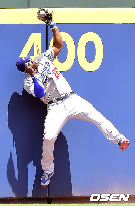 호수비 선보이는 푸이그,'난 펜스가 두렵지 않아'