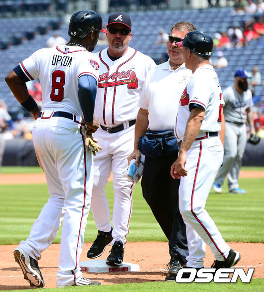 8회말 1사 3루 애틀랜타 업튼이 통증을 호소해 교체되고 있다./youngrae@osen.co.kr