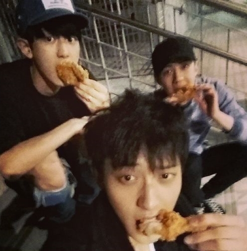 공개된 사진 속 세 사람은 옹기종기 모여 치킨을 입에 문 채 카메라를 응시하고 있다. 특히 세 사람은 흔들림 속에서도 꽃미남 외모를 과시해 눈길을 끌었다.