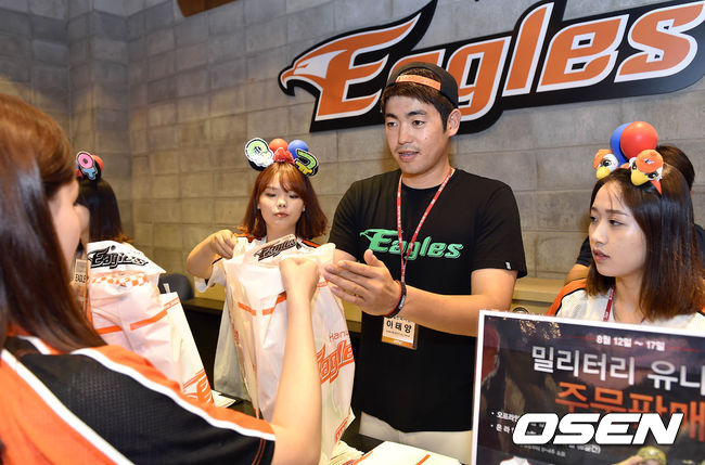 경기에 앞서 이글스샵 일일판매사원으로 나선 한화 이태양이 야구팬들을 맞이하고 있다.