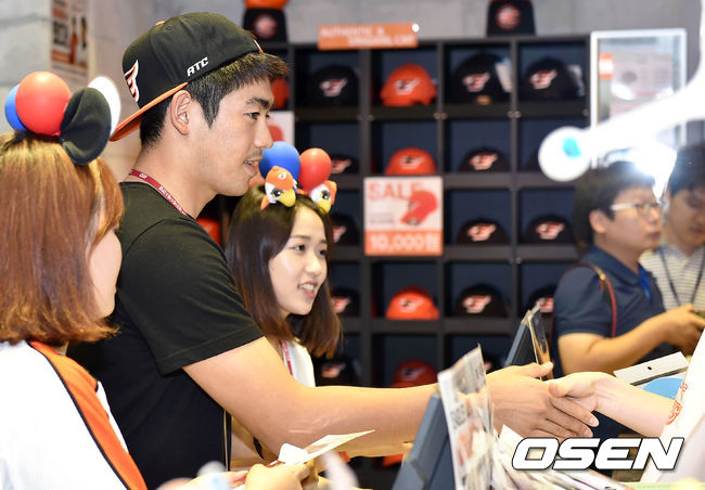 경기에 앞서 이글스샵 일일판매사원으로 나선 한화 이태양이 야구팬들을 맞이하고 있다.