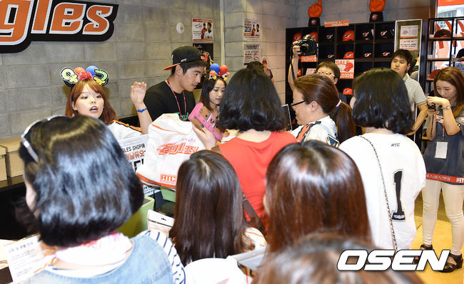 경기에 앞서 이글스샵 일일판매사원으로 나선 한화 이태양이 야구팬들을 맞이하고 있다.