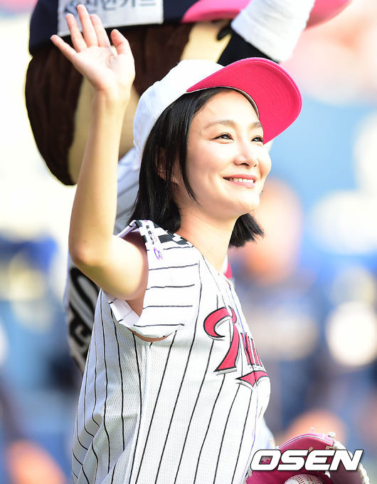 시구자로 나선 배우 박효주가 팬들에게 인사하며 그라운드로 나서고 있다.