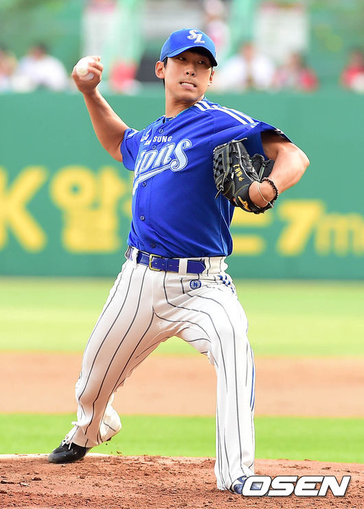 15일 오후 인천 문학구장에서 열린 '2014 한국야쿠르트 세븐 프로야구' SK 와이번스와 삼성 라이온즈의 경기 삼성 선발 윤성환이 역투하고 있다.