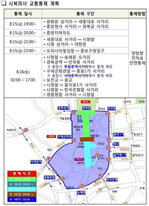 이날 3호선 경복궁역은 오후 12시 30분까지, 5호선 광화문역과 1·2호선 시청역은 오후 1시30분까지 폐쇄된다. 이 때문에 지하철을 타고 광장에 가려면 1호선 종각역, 2호선 을지로입구역, 3호선 안국역, 5호선 서대문역 등지에서 내려 걸어가야 한다.