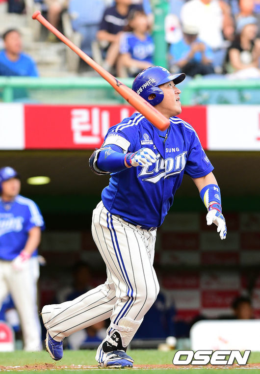 15일 오후 인천 문학구장에서 열린 '2014 한국야쿠르트 세븐 프로야구' SK 와이번스와 삼성 라이온즈의 경기 2회초 선두타자 최형우가 솔로 홈런을 치고 날아가는 타구를 바라보고 있다.