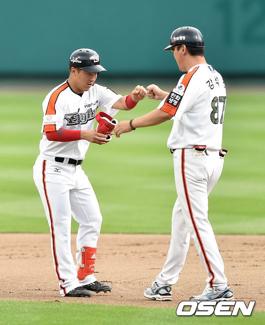 1회말 무사에서 한화 정근우가 좌중간 2루타를 치고 강석천 코치와 하이파이브를 하고 있다.