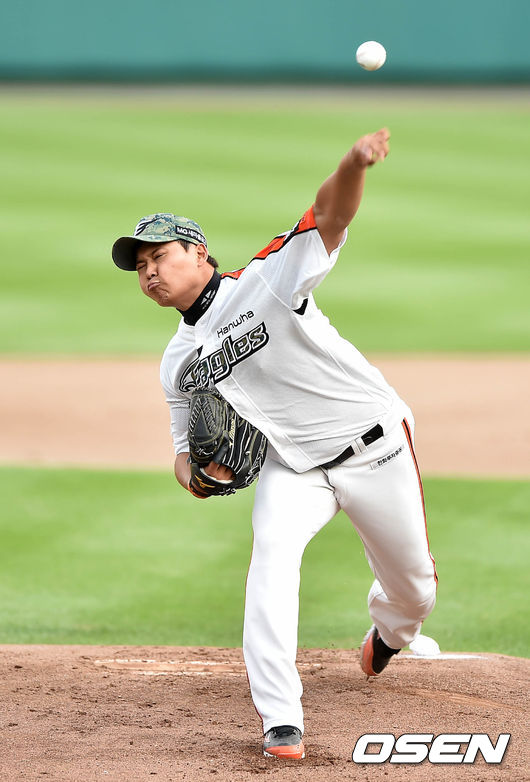1회초 무사에서 한화 선발투수 유창식이 힘차게 공을 던지고 있다.