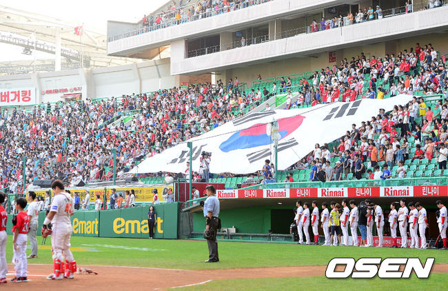 15일 오후 인천 문학구장에서 열린 '2014 한국야쿠르트 세븐 프로야구' SK 와이번스와 삼성 라이온즈의 경기 시작전 국민의례가 진행되는 가운데, 관중석에 대형 태극기가 펼쳐지고 있다.