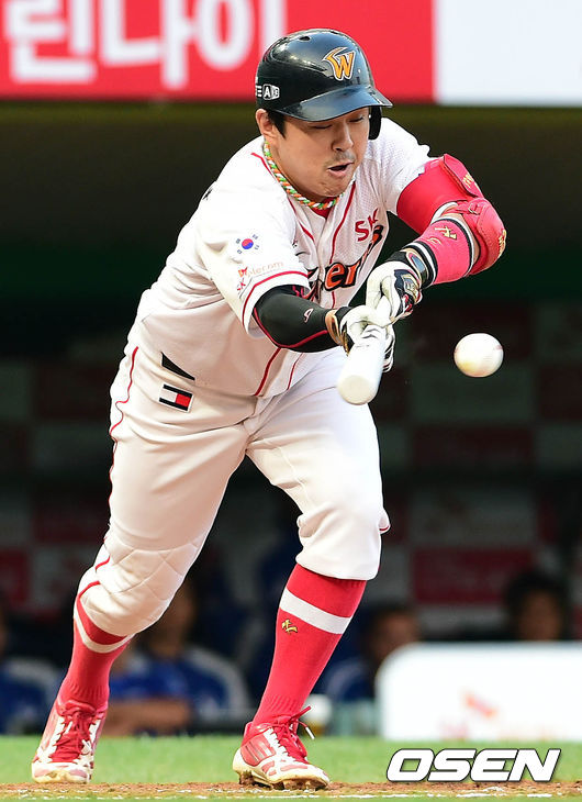 15일 오후 인천 문학구장에서 열린 '2014 한국야쿠르트 세븐 프로야구' SK 와이번스와 삼성 라이온즈의 경기 2회말 무사 1루 나주환이 희생번트를 치고 있다.