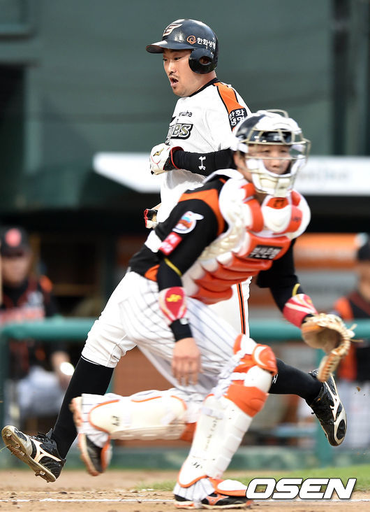 2회말 1사 1루에서 한화 조인성의 내야땅볼때 롯데 송구 실책으로 1루주자 송광민이 홈을 밟고 있다.