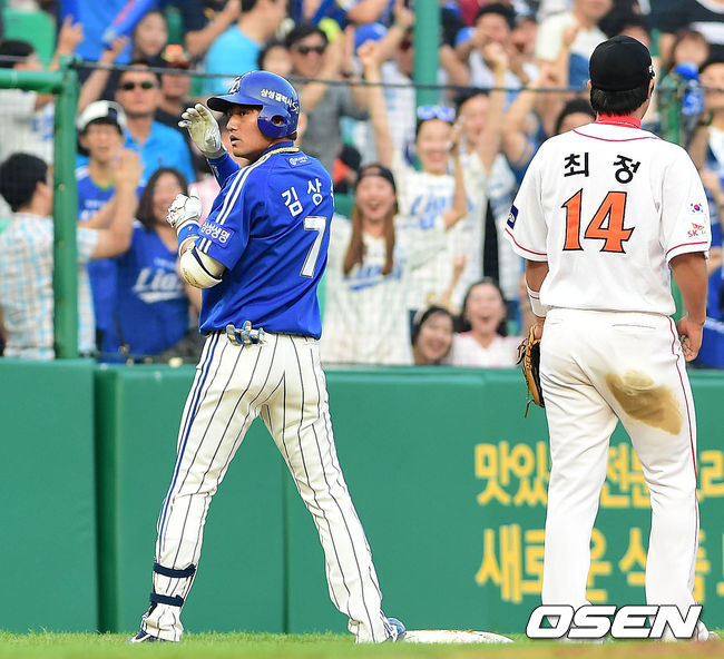 15일 오후 인천 문학구장에서 열린 '2014 한국야쿠르트 세븐 프로야구' SK 와이번스와 삼성 라이온즈의 경기 3회초 무사 2루 김상수의 번트 상황, 번트 타구를 잡은 채병용의 송구 실책으로 김상수가 3루까지 진루하고 있다.