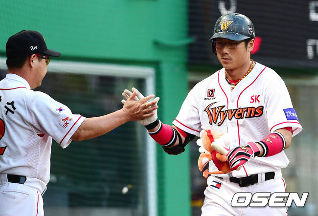 15일 오후 인천 문학구장에서 열린 '2014 한국야쿠르트 세븐 프로야구' SK 와이번스와 삼성 라이온즈의 경기 4회말 1사 박정권이 솔로 홈런을 치고 이만수 감독과 하이파이브를 하고 있다.