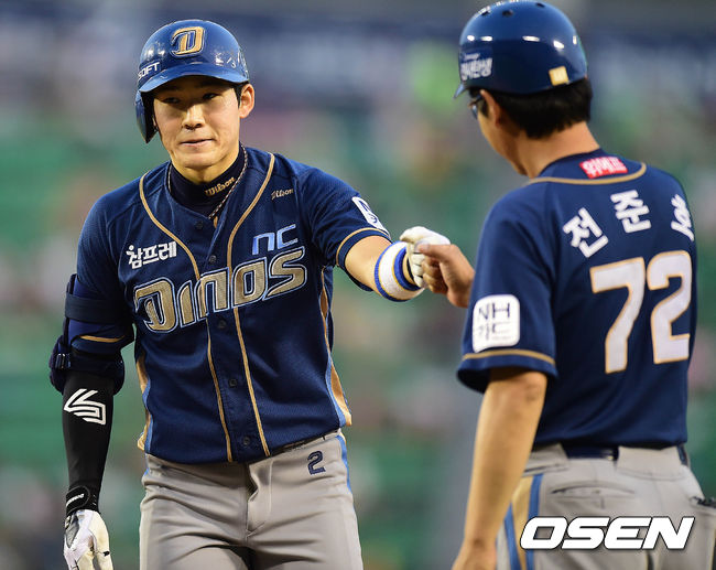 5회초 NC 공격 1사 1, 2루 상황 박민우가 추격의 1타점 적시 중전안타를 날리고 1루에 안착해 전준호 코치와 인사를 나누고 있다.