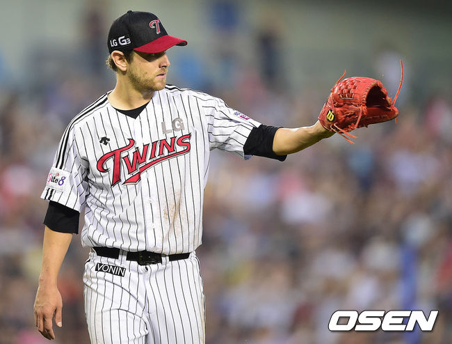 5회초 NC 공격 2사 1, 3루 상황 나성범을 내야 땅볼로 이끌며 이닝을 마친 LG 선발 리오단이 유격수 오지환에게 인사를 건네며 더그아웃으로 들어오고 있다.
