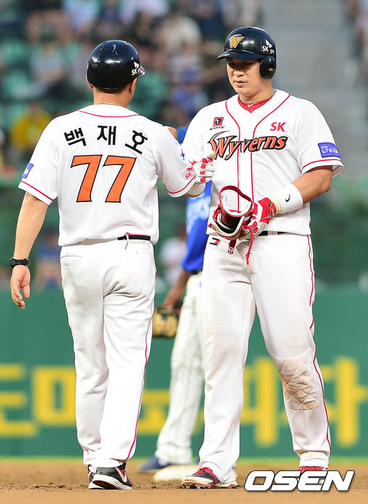 15일 오후 인천 문학구장에서 열린 '2014 한국야쿠르트 세븐 프로야구' SK 와이번스와 삼성 라이온즈의 경기 4회말 2사 1,2루 정상호가 1타점 2루타를 치고 백재호 코치와 하이파이브를 하고 있다.
