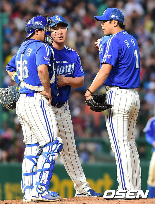 15일 오후 인천 문학구장에서 열린 '2014 한국야쿠르트 세븐 프로야구' SK 와이번스와 삼성 라이온즈의 경기 4회말 2사 2,3루 조동화에게 2타점 2루타를 허용한 윤성환이 김태한 코치와 이야기를 나누고 있다.