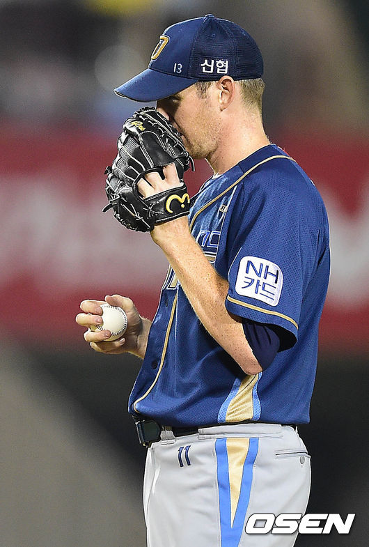 6회말 LG 공격 무사 만루 상황 NC 선발 찰리가 땀을 닦고 있다.