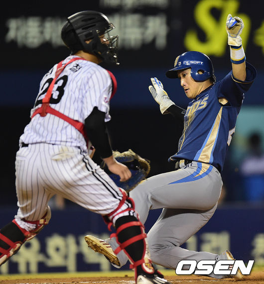 7회초 NC 공격 1사 3루 상황 박민우의 추격의 1타점 중견수 희생플라이 때 대주자 이상호가 홈으로 쇄도해 세이프되고 있다.