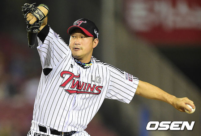 9회초 NC 공격 때 마운드에 오른 LG 투수 봉중근이 힘차게 공을 뿌리고 있다.