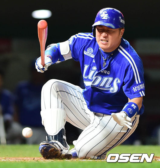 15일 오후 인천 문학구장에서 열린 '2014 한국야쿠르트 세븐 프로야구' SK 와이번스와 삼성 라이온즈의 경기 8회초 무사 1루 최형우가 자신의 타구에 다리를 맞은 후 고통스러워 하고 있다.
