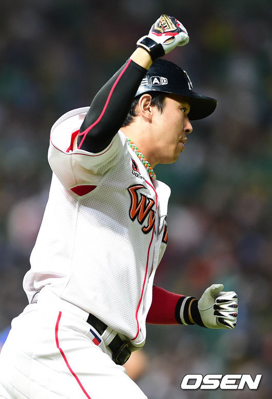 15일 오후 인천 문학구장에서 열린 '2014 한국야쿠르트 세븐 프로야구' SK 와이번스와 삼성 라이온즈의 경기 8회말 선두타자 나주환이 솔로 홈런을 친 후 기뻐하고 있다.