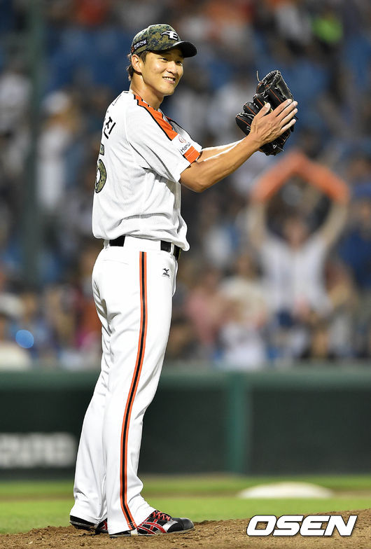 9회말 1사 1루에서 롯데 황재균의 병살타때 한화 윤규진이 환호하고 있다. /sunday@osen.co.kr