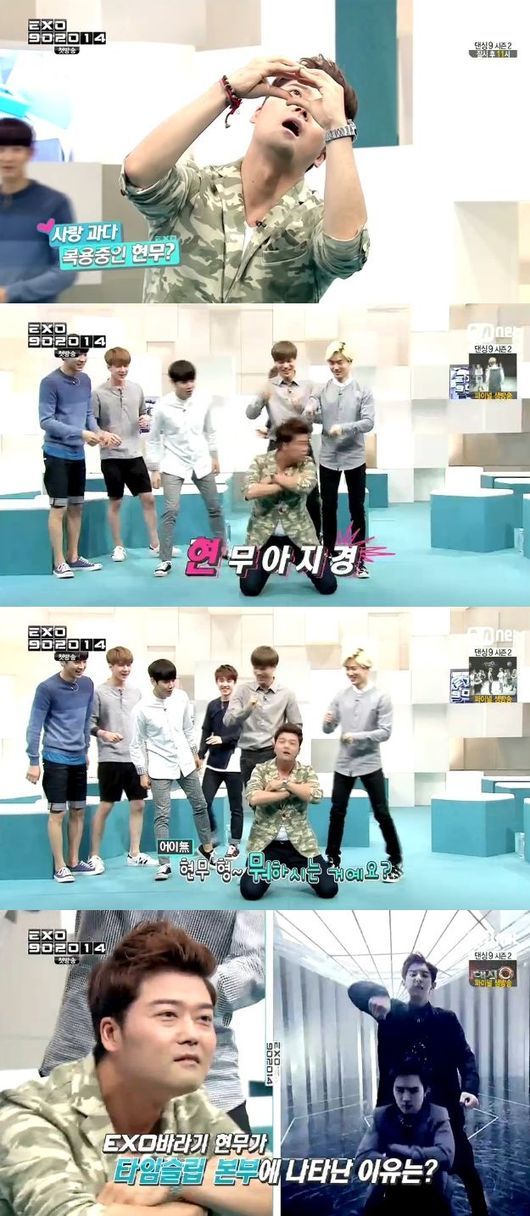 전현무는 15일 오후 10시 방송된 엠넷 'EXO 902014(이하 엑소 902014)' 오프닝을 꾸미며 엑소의 안무를 어색하게 따라했다.