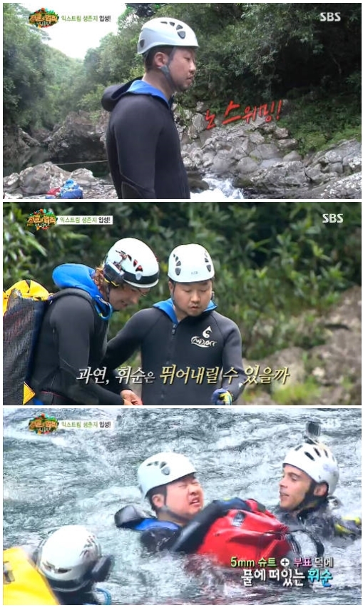 특히 박휘순은 수영을 할 줄 모르는 터라 걱정이 깊었다. 김병만과 수영선수 출신 강지섭과 유이, 수구선수 출신 제임스 등이 거침 없이 물에 뛰어들었지만 박휘순에겐 위로가 되지 않았다. 김승수와 니엘도 무난하게 물에 뛰어들었다.