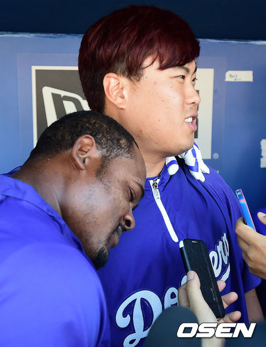 16일(한국시간) 미국 캘리포니아주 로스앤젤레스 다저스타디움에서 열리는 '2014 메이저리그' LA 다저스와 밀워키 브루어스의 경기에 앞서 다저스 유리베가 인터뷰를 하던 류현진에게 장난을 치고 있다.