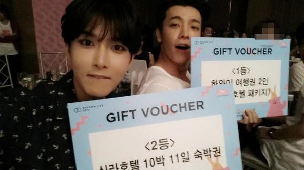 공개된 사진 속 려욱과 동해는 나란히 기프트 바우처를 들고 카메라를 응시하고 있다. 특히 두 사람은 각각 1, 2등을 차지해 눈길을 끌었다. 이날 콘서트 이후 SM아티스트들은 ‘SM타운 라이브 애프터파티(SMTOWN LIVE AFTER PARTY)’를 통해 경품 행사를 진행했다고 전해졌다.