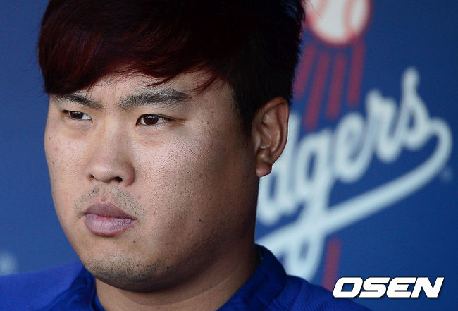 16일(한국시간) 미국 캘리포니아주 로스앤젤레스 다저스타디움에서 열리는 '2014 메이저리그' LA 다저스와 밀워키 브루어스의 경기에 앞서 부상자 명단에 이름을 올린 다저스 류현진이 인터뷰를 하고 있다.