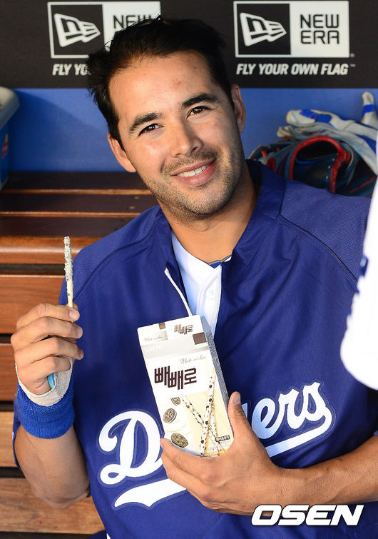 다저스 이디어가 자신이 먹던 과자를 들고 취재진을 향해 포즈를 취하고 있다.