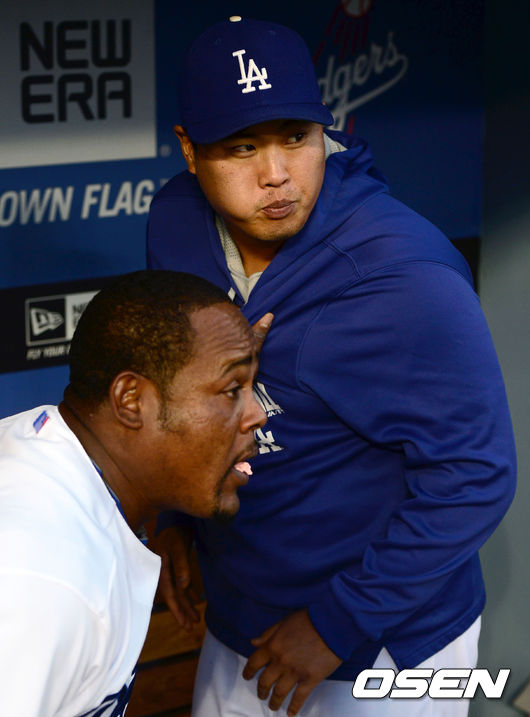 다저스 류현진과 유리베가 장난을 치고 있다.