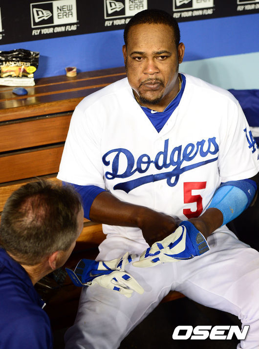 7회초 시작전 다저스 유리베가 오른쪽 허벅지 통증을 호소해 트레이너와 이야기를 나누고 있다.