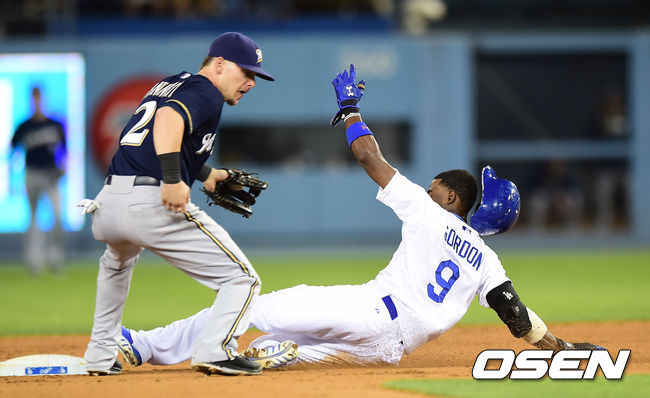 5회말 1사 1루 다저스 디 고든이 2루 도루를 시도하고 있다.