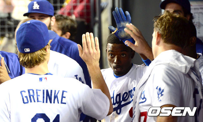 5회말 1사 2루 다저스 디 고든이 푸이그의 적시타로 득점을 올린 뒤 그레인키와 하이파이브를 하고 있다.