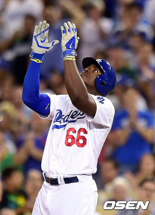 5회말 1사 2루 다저스 푸이그가 적시타를 때린 뒤 세레머니를 하고 있다.
