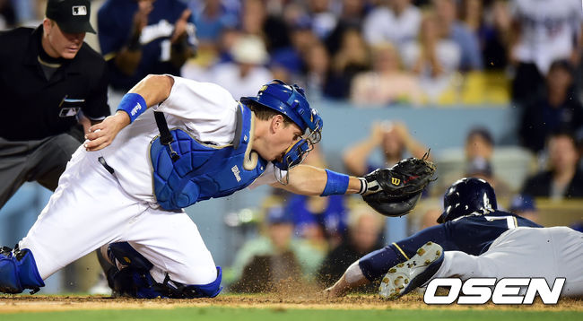 8회초 2사 만루 다저스 A.J 엘리스가 밀워키 오버베이의 적시타로 홈으로 쇄도하는 제넷을 태그하고 있다.