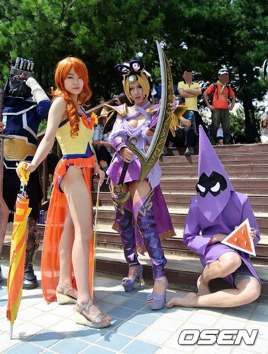 16일 오후 부산 해운대 특설무대에서 '핫식스 LOL챔피언스(이하 롤챔스)' 서머 2014 결승전이 열린다. 오후 6시부터 열리는 결승전을 앞두고 롤 챔피언 코스프레 팀이 포즈를 취하고 있다. 왼쪽부터 수영복 파티 레오나, 달빛여신 다이애나, 미니언.