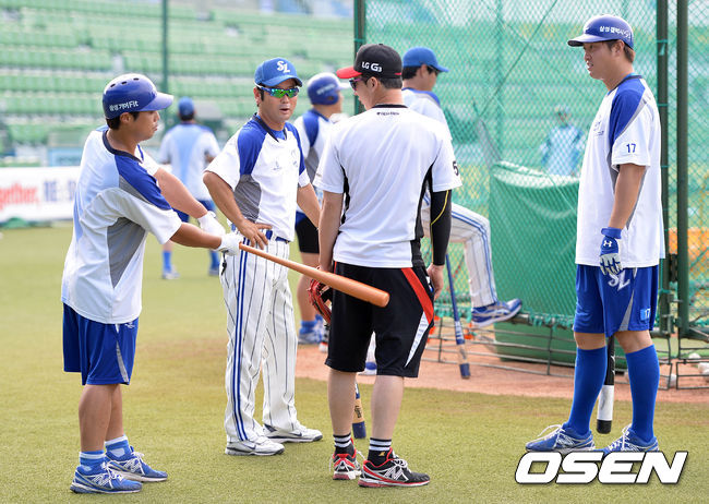 경기에 앞서 삼성 김태완이 LG 손주인을 배트로 때리는 시늉을 하고 있다.
