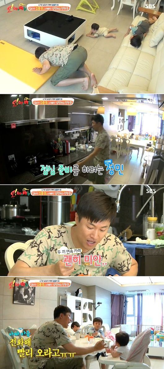 김정민은 16일 오후 방송된 SBS 예능프로그램 ‘오! 마이 베이비’(이하 ‘오마베’)에서 미용실로 외출한 타니 루미코 대신 삼형제에게 직접 밥을 차려줬다.