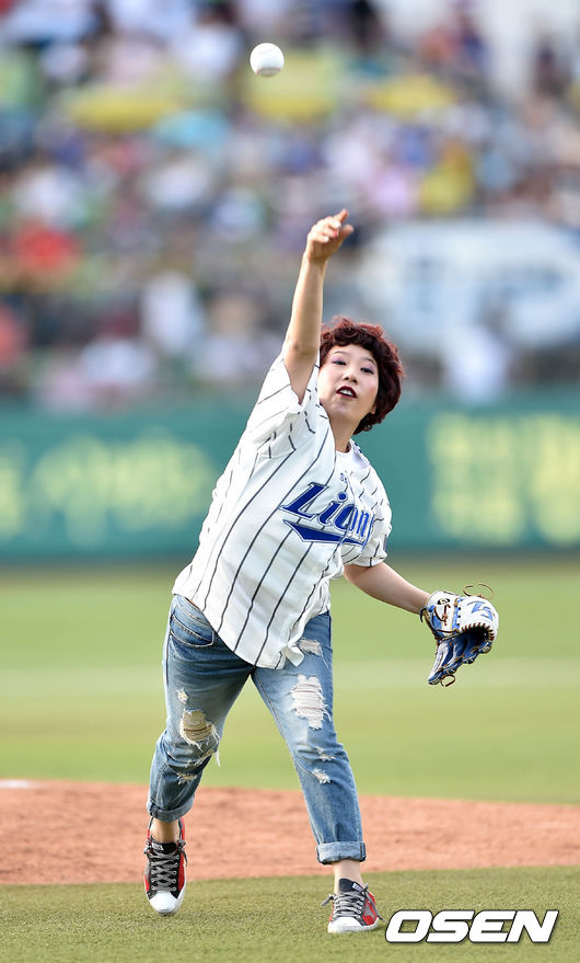 경기에 앞서 개그우먼 김영희가 시구를 하고 있다.